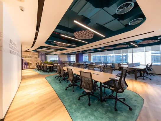 DXC Technology office design emphasizes modern, open, and fluid layouts with a focus on functionality and employee well-being. The design incorpo-rates elements like modular work areas, glass-walled meeting rooms, and breakout spaces to foster collaboration and flexibility. Strategic use of colors, like neutral tones with pops of colors and natural materials contribute to a vibrant and comfortable atmosphere.