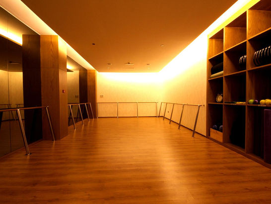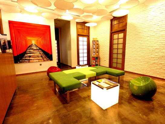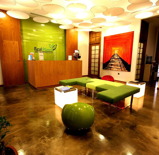 This wellness studio was designed as a holistic sanctuarybalancing energet-ic vibrance with grounded calm. Natural textures such as polished concrete floors and wood finishes evoke an earthy authenticity, while bold green tones and vibrant artwork infuse the space with vitality and movement.